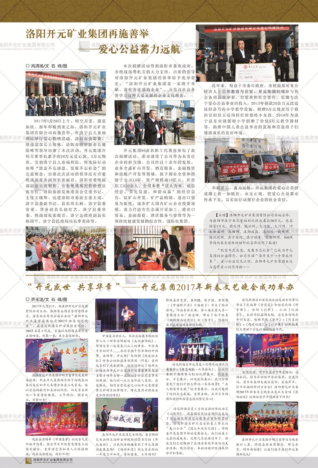 洛陽(yáng)開(kāi)元礦業(yè)集團(tuán)有限公司簡(jiǎn)介洛陽(yáng)開(kāi)元礦業(yè)集團(tuán)有限公司,始成立于2006年,位于洛陽(yáng)市開(kāi)元大道269號(hào)。集團(tuán)旗下共有五余家全資子公司,業(yè)務(wù)涉及有色金屬礦山開(kāi)發(fā)、礦產(chǎn)品購(gòu)銷(xiāo)與進(jìn)出口貿(mào)易、房地產(chǎn)開(kāi)發(fā)、文化藝術(shù)、企業(yè)管理與咨詢(xún)、資本投資等多個(gè)領(lǐng)域。民建河南省委委員、民建河南省委企業(yè)委副主任、民建洛陽(yáng)市委委員、企業(yè)委主任、洛陽(yáng)民建企業(yè)家協(xié)會(huì)會(huì)長(zhǎng)許明月是公司創(chuàng)始人,現(xiàn)任洛陽(yáng)開(kāi)元礦業(yè)集團(tuán)有限公司董事長(zhǎng)。在礦業(yè)領(lǐng)域,洛陽(yáng)開(kāi)元礦業(yè)集團(tuán)擁有多家實(shí)力雄厚的子公司:貴州開(kāi)元礦業(yè)有限公司探、采礦權(quán)面積共11.33平方公里;興??h銅鑫礦業(yè)有限公司探礦權(quán)面積8.76平方公里,礦山資源潛力巨大;2021年,開(kāi)元集團(tuán)與盧氏中科礦業(yè)有限公司開(kāi)展戰(zhàn)略合作。盧氏中科礦業(yè)有限公司專(zhuān)注于有色金屬的浮選、加工和銷(xiāo)售,擁有強(qiáng)大的技術(shù)支撐平臺(tái),是集探、采、選、冶、研為一體的中大型綜合礦業(yè)企業(yè)。目前,盧氏中科王家河1000噸選礦廠已成功投產(chǎn),雙河金礦、柳關(guān)欒盧鉛鋅礦相繼順利開(kāi)工,樓房銀礦與圪老灣鉛鋅礦的深部探礦重大突破,標(biāo)志著礦山版圖取得重大進(jìn)展,為開(kāi)元集團(tuán)后續(xù)發(fā)展奠定了堅(jiān)實(shí)基礎(chǔ)。在文化傳媒領(lǐng)域,洛陽(yáng)市明月美術(shù)館通過(guò)豐富多樣的藝術(shù)展覽、學(xué)術(shù)研討和公共教育活動(dòng),努力打造一個(gè)集展覽、交流、教育、研究為一體的綜合性藝術(shù)平臺(tái)。此外,在金融投資領(lǐng)域,開(kāi)元集團(tuán)旗下的北京明峰資本管理有限公司專(zhuān)注于投資具有高增長(zhǎng)潛力的優(yōu)秀企業(yè),特別是高科技、新能源、環(huán)保等新興產(chǎn)業(yè),為客戶提供個(gè)性化的資產(chǎn)配置服務(wù)。在做好企業(yè)經(jīng)營(yíng)的同時(shí),開(kāi)元集團(tuán)始終不忘企業(yè)的社會(huì)責(zé)任和家國(guó)情懷,以突出的愛(ài)心公益事跡,開(kāi)展了一系列公益慈善活動(dòng):“民建林”公益事業(yè)通過(guò)“思源基金”“幫幫公益”線上公益平臺(tái),與眾多愛(ài)心人士籌措資金20余萬(wàn)元;資助541名貧困大學(xué)生共計(jì)270余萬(wàn)元,推進(jìn)“數(shù)字助力——河南AI人才培養(yǎng)”;捐款10萬(wàn)元,馳援京津冀、黑龍江洪水地質(zhì)災(zāi)害……公司于2017年底被洛陽(yáng)市慈善總會(huì)評(píng)為“洛陽(yáng)慈善風(fēng)云榜——十大愛(ài)心集體”。洛陽(yáng)開(kāi)元礦業(yè)集團(tuán)有限公司秉承持續(xù)發(fā)展理念,憑借多年來(lái)良好的企業(yè)信譽(yù)與經(jīng)營(yíng)業(yè)績(jī),與全國(guó)多家企業(yè)建立了良好合作關(guān)系,受到社會(huì)各界的一致好評(píng),多次榮獲“納稅標(biāo)兵”“先進(jìn)企業(yè)”“招商引資模范企業(yè)”等榮譽(yù)稱(chēng)號(hào)。回望來(lái)時(shí)路,開(kāi)元人勠力同心,以“闖”的精神和“創(chuàng)”的勁頭,一路披荊斬棘,踏過(guò)千山萬(wàn)水;展望新未來(lái),開(kāi)元人凝心聚力,不執(zhí)于“舊”,無(wú)畏于“新”,秉承“勇于跨越,追求卓越”的企業(yè)精神,乘著國(guó)家高質(zhì)量發(fā)展新征程的東風(fēng),跨過(guò)高山,越過(guò)大海,向著集團(tuán)多元化、國(guó)際化的目標(biāo),逐夢(mèng)遠(yuǎn)航,跨越前行!