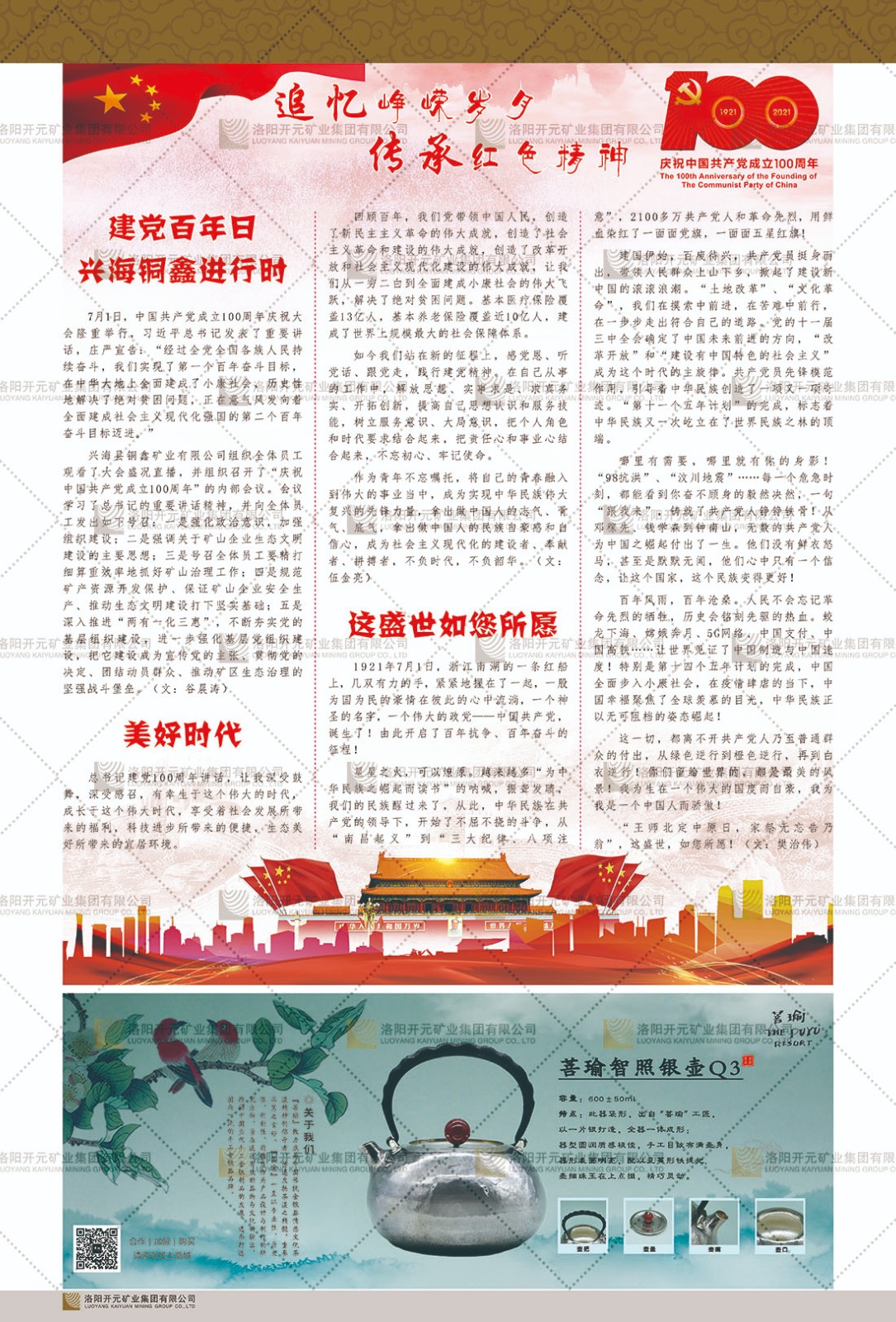 洛陽開元礦業(yè)集團有限公司簡介洛陽開元礦業(yè)集團有限公司,始成立于2006年,位于洛陽市開元大道269號。集團旗下共有五余家全資子公司,業(yè)務涉及有色金屬礦山開發(fā)、礦產(chǎn)品購銷與進出口貿(mào)易、房地產(chǎn)開發(fā)、文化藝術、企業(yè)管理與咨詢、資本投資等多個領域。民建河南省委委員、民建河南省委企業(yè)委副主任、民建洛陽市委委員、企業(yè)委主任、洛陽民建企業(yè)家協(xié)會會長許明月是公司創(chuàng)始人,現(xiàn)任洛陽開元礦業(yè)集團有限公司董事長。在礦業(yè)領域,洛陽開元礦業(yè)集團擁有多家實力雄厚的子公司:貴州開元礦業(yè)有限公司探、采礦權面積共11.33平方公里;興??h銅鑫礦業(yè)有限公司探礦權面積8.76平方公里,礦山資源潛力巨大;2021年,開元集團與盧氏中科礦業(yè)有限公司開展戰(zhàn)略合作。盧氏中科礦業(yè)有限公司專注于有色金屬的浮選、加工和銷售,擁有強大的技術支撐平臺,是集探、采、選、冶、研為一體的中大型綜合礦業(yè)企業(yè)。目前,盧氏中科王家河1000噸選礦廠已成功投產(chǎn),雙河金礦、柳關欒盧鉛鋅礦相繼順利開工,樓房銀礦與圪老灣鉛鋅礦的深部探礦重大突破,標志著礦山版圖取得重大進展,為開元集團后續(xù)發(fā)展奠定了堅實基礎。在文化傳媒領域,洛陽市明月美術館通過豐富多樣的藝術展覽、學術研討和公共教育活動,努力打造一個集展覽、交流、教育、研究為一體的綜合性藝術平臺。此外,在金融投資領域,開元集團旗下的北京明峰資本管理有限公司專注于投資具有高增長潛力的優(yōu)秀企業(yè),特別是高科技、新能源、環(huán)保等新興產(chǎn)業(yè),為客戶提供個性化的資產(chǎn)配置服務。在做好企業(yè)經(jīng)營的同時,開元集團始終不忘企業(yè)的社會責任和家國情懷,以突出的愛心公益事跡,開展了一系列公益慈善活動:“民建林”公益事業(yè)通過“思源基金”“幫幫公益”線上公益平臺,與眾多愛心人士籌措資金20余萬元;資助541名貧困大學生共計270余萬元,推進“數(shù)字助力——河南AI人才培養(yǎng)”;捐款10萬元,馳援京津冀、黑龍江洪水地質災害……公司于2017年底被洛陽市慈善總會評為“洛陽慈善風云榜——十大愛心集體”。洛陽開元礦業(yè)集團有限公司秉承持續(xù)發(fā)展理念,憑借多年來良好的企業(yè)信譽與經(jīng)營業(yè)績,與全國多家企業(yè)建立了良好合作關系,受到社會各界的一致好評,多次榮獲“納稅標兵”“先進企業(yè)”“招商引資模范企業(yè)”等榮譽稱號。回望來時路,開元人勠力同心,以“闖”的精神和“創(chuàng)”的勁頭,一路披荊斬棘,踏過千山萬水;展望新未來,開元人凝心聚力,不執(zhí)于“舊”,無畏于“新”,秉承“勇于跨越,追求卓越”的企業(yè)精神,乘著國家高質量發(fā)展新征程的東風,跨過高山,越過大海,向著集團多元化、國際化的目標,逐夢遠航,跨越前行!