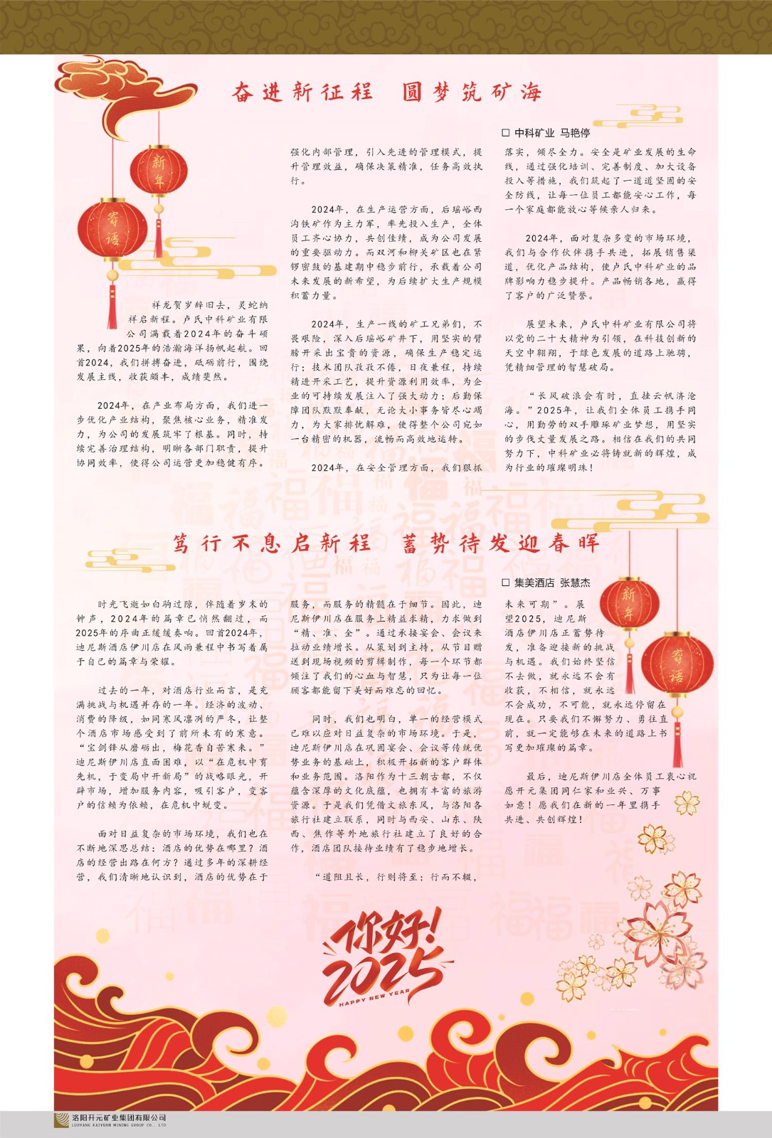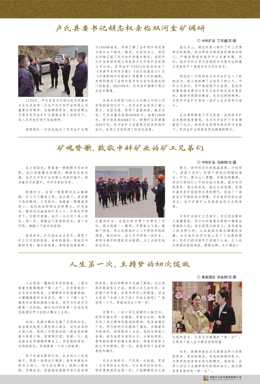 洛陽開元礦業(yè)集團有限公司簡介洛陽開元礦業(yè)集團有限公司,始成立于2006年,位于洛陽市開元大道269號。集團旗下共有五余家全資子公司,業(yè)務涉及有色金屬礦山開發(fā)、礦產品購銷與進出口貿易、房地產開發(fā)、文化藝術、企業(yè)管理與咨詢、資本投資等多個領域。民建河南省委委員、民建河南省委企業(yè)委副主任、民建洛陽市委委員、企業(yè)委主任、洛陽民建企業(yè)家協會會長許明月是公司創(chuàng)始人,現任洛陽開元礦業(yè)集團有限公司董事長。在礦業(yè)領域,洛陽開元礦業(yè)集團擁有多家實力雄厚的子公司:貴州開元礦業(yè)有限公司探、采礦權面積共11.33平方公里;興??h銅鑫礦業(yè)有限公司探礦權面積8.76平方公里,礦山資源潛力巨大;2021年,開元集團與盧氏中科礦業(yè)有限公司開展戰(zhàn)略合作。盧氏中科礦業(yè)有限公司專注于有色金屬的浮選、加工和銷售,擁有強大的技術支撐平臺,是集探、采、選、冶、研為一體的中大型綜合礦業(yè)企業(yè)。目前,盧氏中科王家河1000噸選礦廠已成功投產,雙河金礦、柳關欒盧鉛鋅礦相繼順利開工,樓房銀礦與圪老灣鉛鋅礦的深部探礦重大突破,標志著礦山版圖取得重大進展,為開元集團后續(xù)發(fā)展奠定了堅實基礎。在文化傳媒領域,洛陽市明月美術館通過豐富多樣的藝術展覽、學術研討和公共教育活動,努力打造一個集展覽、交流、教育、研究為一體的綜合性藝術平臺。此外,在金融投資領域,開元集團旗下的北京明峰資本管理有限公司專注于投資具有高增長潛力的優(yōu)秀企業(yè),特別是高科技、新能源、環(huán)保等新興產業(yè),為客戶提供個性化的資產配置服務。在做好企業(yè)經營的同時,開元集團始終不忘企業(yè)的社會責任和家國情懷,以突出的愛心公益事跡,開展了一系列公益慈善活動:“民建林”公益事業(yè)通過“思源基金”“幫幫公益”線上公益平臺,與眾多愛心人士籌措資金20余萬元;資助541名貧困大學生共計270余萬元,推進“數字助力——河南AI人才培養(yǎng)”;捐款10萬元,馳援京津冀、黑龍江洪水地質災害……公司于2017年底被洛陽市慈善總會評為“洛陽慈善風云榜——十大愛心集體”。洛陽開元礦業(yè)集團有限公司秉承持續(xù)發(fā)展理念,憑借多年來良好的企業(yè)信譽與經營業(yè)績,與全國多家企業(yè)建立了良好合作關系,受到社會各界的一致好評,多次榮獲“納稅標兵”“先進企業(yè)”“招商引資模范企業(yè)”等榮譽稱號。回望來時路,開元人勠力同心,以“闖”的精神和“創(chuàng)”的勁頭,一路披荊斬棘,踏過千山萬水;展望新未來,開元人凝心聚力,不執(zhí)于“舊”,無畏于“新”,秉承“勇于跨越,追求卓越”的企業(yè)精神,乘著國家高質量發(fā)展新征程的東風,跨過高山,越過大海,向著集團多元化、國際化的目標,逐夢遠航,跨越前行!